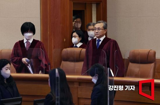검찰 수사권 완전 박탈(검수완박) 법안에 대한 헌법재판소의 권한쟁의심판 선고일인 23일 서울 종로구 헌법재판소에서 유남석 헌법재판소장과 헌법재판관들이 대심판정으로 들어서고 있다. 사진=강진형 기자aymsdream@