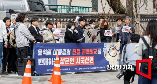 24일 서울 종로구 성균관대학교 명륜캠퍼스 정문 앞에서 성균관대 재학생 및 졸업생들이 윤석열 대통령 친일 굴욕외교 규탄하는 시국선언을 하고 있다.