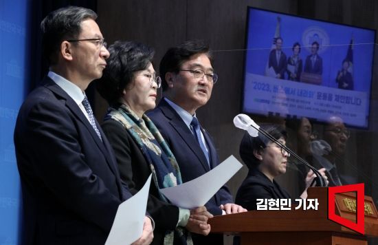 더불어민주당 4선 중진 의원들이 24일 서울 여의도 국회 소통관에서 현안 관련 기자회견을 열고 '2023, 버스에서 내려와' 운동을 제안하고 있다. 왼쪽부터 정성호, 김상희, 우원식 의원. 사진=김현민 기자 kimhyun81@