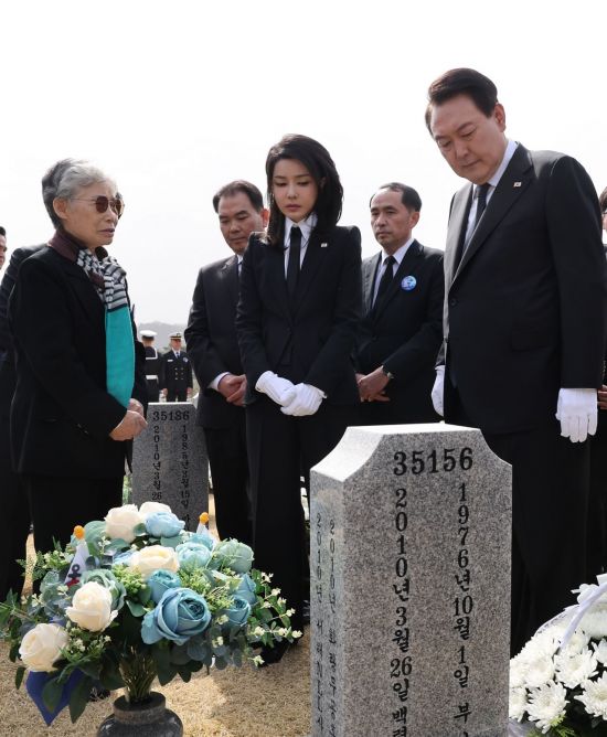 기념식에 앞서 윤 대통령은 김건희 여사와 함께 제2연평해전·천안함 피격사건 전사자 묘역을 참배했다. 검은 양복에 검은 넥타이 차림을 한 윤 대통령은 입구에서부터 유족들과 인사를 나눴다.