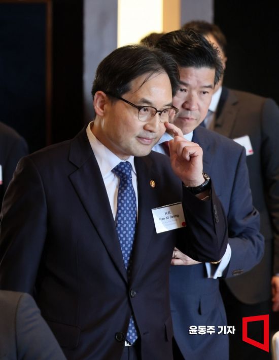 한기정 공정거래위원장과 제임스김 암참 회장이 20일 서울 용산구 그랜드 하얏트 서울 호텔에서 열린 주한미국상공회의소(암참) 주최 공정거래위원장 초청 특별 간담회에 참석하고 있다. 사진=윤동주 기자 doso7@