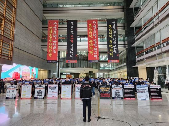 27일 금융권에 따르면, 전국금융산업노동조합 한국산업은행 지부는 이날 오전 본점에서 '강석훈 회장 및 전체 임원 출근 저지 및 불통 이전 중단 촉구 결의대회'를 개최했다.
