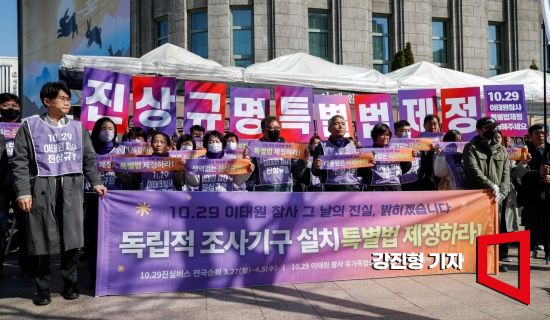 27일 서울 중구 서울광장에 마련된 이태원참사 희생자 합동분향소 앞에서 10.29 이태원참사 시민대책회의 관계자들이 10.29 진실버스 10일간 전국순례 출발을 앞두고 기자회견을 하고 있다.