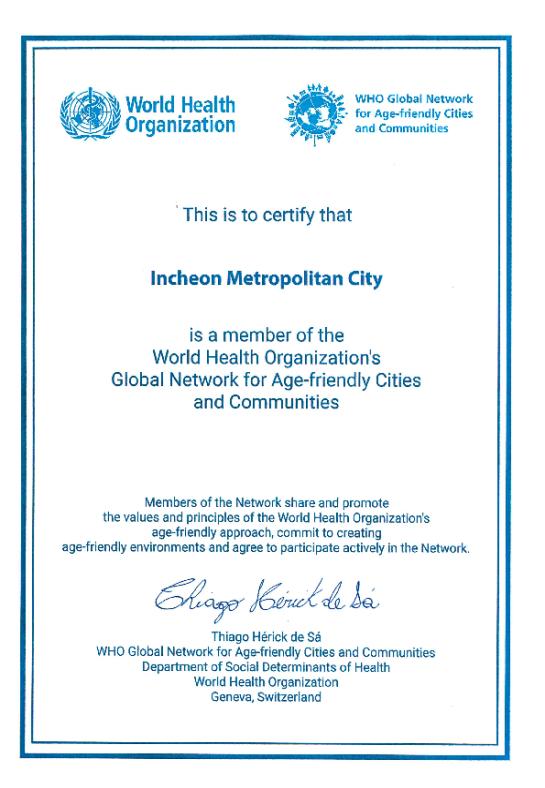인천시는 세계보건기구(WHO)로부터 고령친화도시(age- friendly city) 국제네트워크 가입 인증을 받았다고 27일 밝혔다.