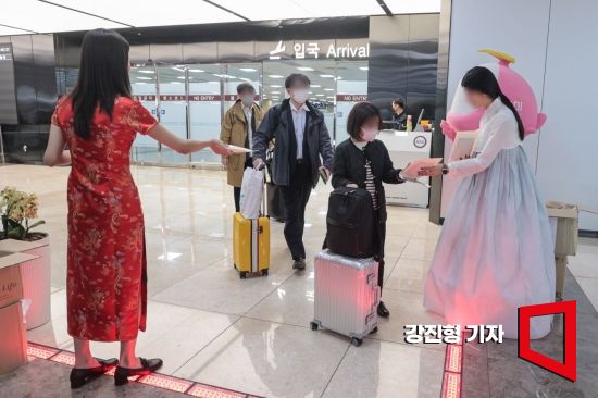 27일 오후 한국공항공사 관계자들이 김포공항에서 김포-북경·상해 노선 운항 재개를 기념해 입국하는 승객들에게 기념품을 나눠주고 있다.