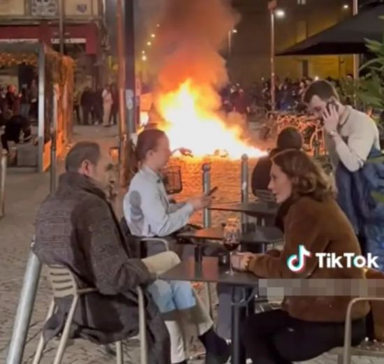 프랑스 정부의 연금 개혁을 반대하는 대규모 시위가 도시 곳곳에서 잇따라 벌어지는 가운데, 아수라장에도 아랑곳하지 않고 느긋하게 식사를 즐기는 시민들의 동영상이 인기를 얻고 있다.