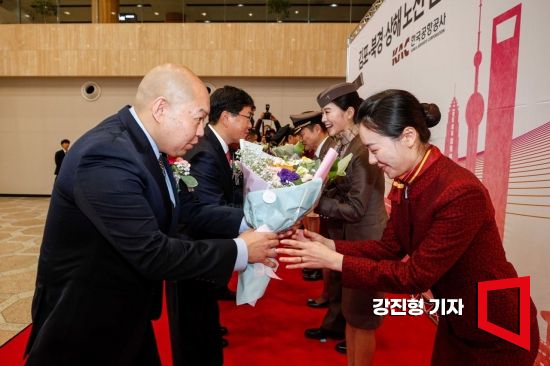 윤형중 한국공항공사 사장과 싱 하이 밍 주한중국대사를 비롯한 한중 항공사 대표들이 27일 서울 강서구 김포국제공항 국제선에서 열린 '김포-북경,상해 노선 운항재개 기념식'에 참석해 기장 및 승무원에게 꽃다발을 전달하고 있다.