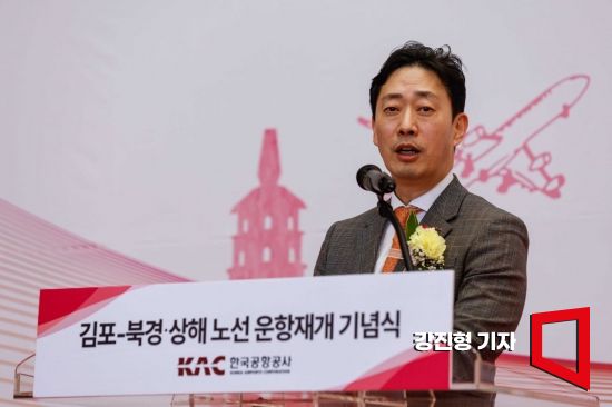 윤형중 한국공항공사 사장이 27일 서울 강서구 김포국제공항 국제선에서 열린 '김포-북경,상해 노선 운항재개 기념식'에 참석해 기념사 하고 있다.