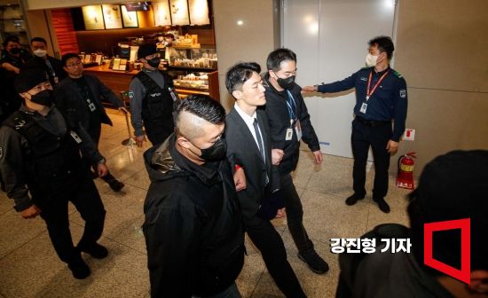 마약 투약 혐의를 받는 고 전두환 전 대통령의 손자 전우원 씨가 28일 인천국제공항 제2여객터미널을 통해 입국한 뒤 체포되고 있다.