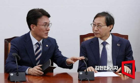 김민석 더불어민주당 정책위의장과 김성주 정책위 수석부의장이 28일 서울 여의도 국회에서 열린 원내대책회의에서 대화하고 있다. 사진=김현민 기자 kimhyun81@
