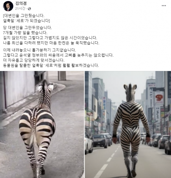 더불어민주당 대변인직에서 물러난 김의겸 의원이 최근 동물원을 탈출해 화제가 된 얼룩말 '세로'를 언급하며 "더 자유롭고 당당하게 맞서겠다. 세로처럼 훨훨 활보하겠다"고 소회를 밝혔다.