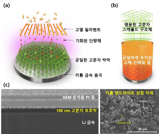 리튬 금속의 낮은 쿨룽 효율, 짧은 전지 수명, 폭발 위험 등을 막기 위해 인공으로 고체-전해질 계면(SEI) 층을 보호막처럼 만들어 리튬 이온의 원활한 전달과 덴드라이트의 성장을 억제하기 위한 다양한 연구들이 진행됐다. 그러나 기존의 인공 SEI 층들은 두께가 두꺼워 전지 내부의 높은 저항이 발생한다. 수백 사이클 이상의 구동 시 리튬 금속으로부터 떨어져 리튬 금속 음극의 장시간 안정성을 유지하기가 어렵다. SEI 층의 형성 과정에서 반응성이 매우 큰 리튬의 손상이 발생하는 경우가 많아 원하는 형태의 SEI 층을 형성하기가 힘들었다.
