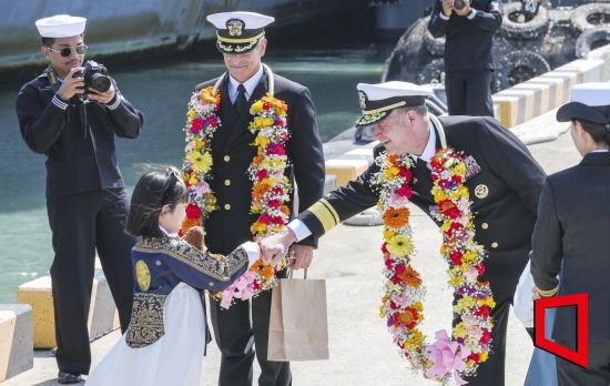 28일 부산 작전기지에 미국 핵 추진 항공모함 니미츠(CVN-68)가 입항해 미 제11항모강습단 크리스토퍼 스위니 단장이 화동과 인사를 나누고 있다. 사진=사진공동취재단