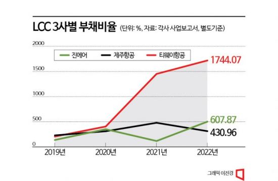 29일 진에어의 지난해 사업보고서를 보면 부채비율이 607.87%다. 지난 2019년 267.37%에서 340%포인트 가까이 치솟았다. 같은 기간 제주항공은 352.74%에서 430.96%로 티웨이항공도 331.15%에서 1744.07%로 뛰었다.