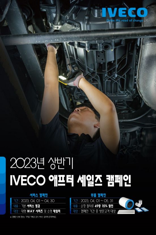 이탈리아 상용차 브랜드 이베코(IVECO)의 한국지사인 이베코코리아가 4월 1일부터 4월 30일까지 한 달간, 대형 및 소형 상용차 전 차종을 대상으로 2023년 상반기 서비스 캠페인을 실시한다. 순정 필터류를 할인된 가격에 제공하는 부품 캠페인은 5월 31일까지 진행한다.