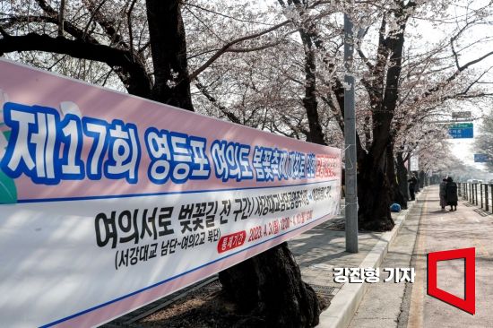 전국 벚꽃 개화가 예년보다 빨라진 29일 서울 여의도 윤중로에 봄꽃축제 교통통제 관련 안내 현수막이 걸려 있다.