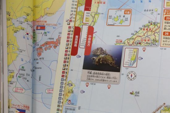 일본 문부과학성이 28일 교과서 검정심의회를 열어 2024년도부터 초등학교에서 쓰일 교과서 149종이 심사를 통과했다고 밝혔다. 그중 일부 초등학교 사회와 지도 교과서에서는 한국 땅인 독도에 관한 일본의 영유권 주장이 강화됐다. 사진에서 오른쪽 책은 독도에 대해 현행 "한국에 점거돼"라는 표현을 "한국에 불법으로 점거돼"로 바꾼 도쿄서적 지도 교과서. [이미지출처=연합뉴스]
