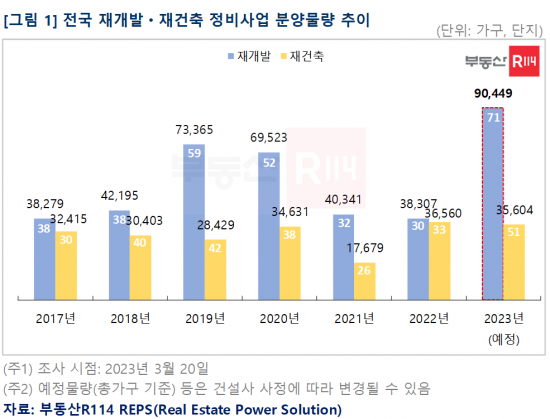 29일 부동산R114에 따르면 올해 재개발·재건축 정비사업을 통한 분양물량은 12만6053가구로 2019년(101개 단지 10만1794가구) 이후 가장 많은 물량으로 집계됐다.