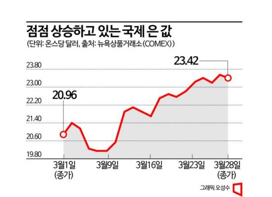 뉴욕상품거래소에 따르면 4월물 국제 은 선물 가격은 전 거래일 대비 1.19% 오른 트로이 온스당 23.42달러(현지시간 28일 기준)에 장을 마쳤다. 국제 은 가격은 이달 들어(3월 1일~3월 28일) 무려 11.78% 올랐다. 같은 기간 국제 금값 상승세(6.94%)의 약 2배에 이르는 수준이다.