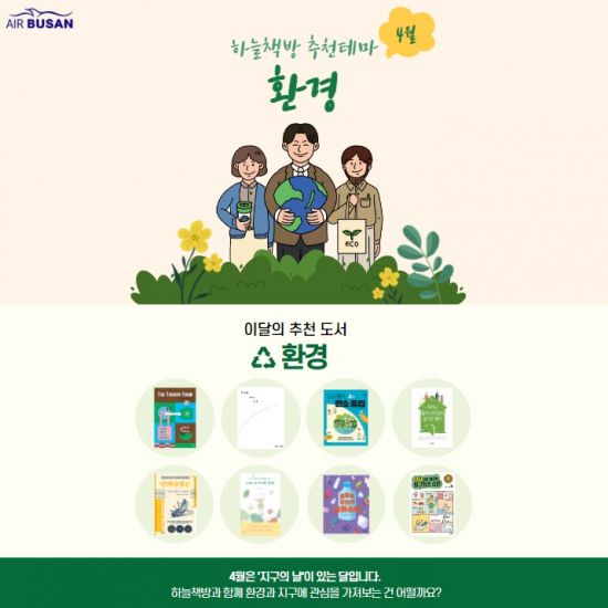 에어부산은 하늘 책방 이용 회원들의 독서 분야를 넓히고자 매달 하늘 책방의 새로운 독서 테마를 선정하고 그에 맞는 도서를 추천하고 있다.