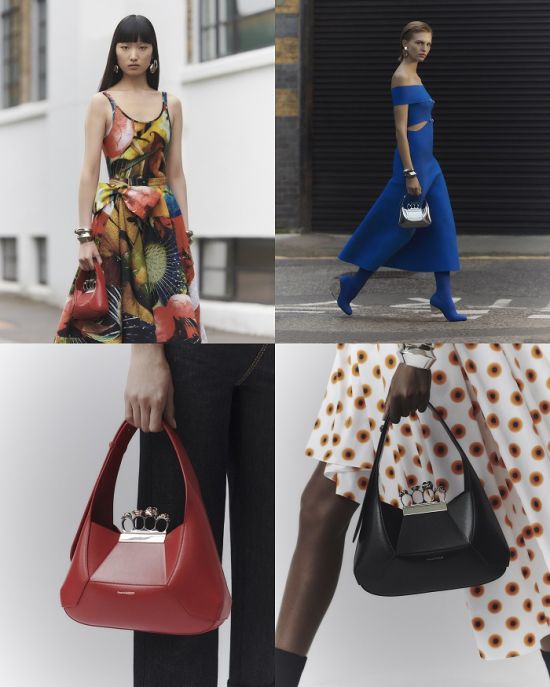맥퀸 하우스의 아이코닉 너클의 스톤 장식에서 영감을 받은 패싯 실루엣이 돋보이는 주얼 호보 백은 2023 봄/여름 컬렉션에서 브라이트 레드, 브라이트 블루 그리고 미러링 실버 컬러의 생동감 넘치는 새로운 컬러 팔레트로 선보여 화제를 모았다.