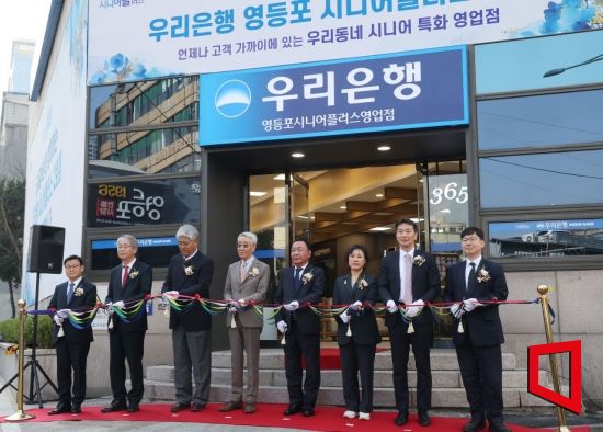 인터넷과 모바일 금융거래에 익숙치 않은 시니어들을 위한 우리은행 시니어플러스점 2호점이 서울 영등포에 개점했다. 이복현 금융감독원장(오른쪽 두번째)과 임종룡 우리금융그룹회장(왼쪽 두번째) 등 참석자들이 지점 고객 대표들과 함께 테이프 커팅을 하고 있다. 사진=허영한 기자 younghan@