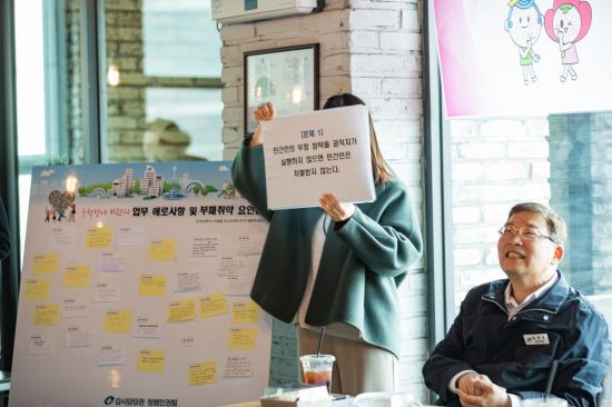 간담회에 참석한 직원들은 구청장과 함께 공사·계약, 보조금, 신속 집행과 관련한 부패 취약 요인들에 대해 이야기를 나누고, 투명한 제도 구축과 악성 민원 대처 방안 교육, 부정부패 신고 문화 확산 등의 필요성을 강조했다.