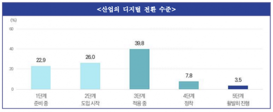 국내 기업의 디지털 전환 수준이 해외 기업보다 1~1.5단계 뒤처진 것으로 나타났다. 특히 국내 중견·중소기업의 도입 비율이 낮아 정부의 정책 지원이 필요하다는 조언이 나왔다.