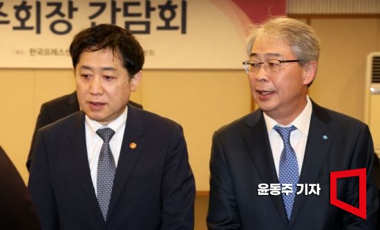 김주현 금융위원장이 31일 서울 중구 프레스센터에서 열린 금융지주회장 간담회에 참석, 간담회에 앞서 임종룡 우리금융지주 회장과 이야기를 나누고 있다. 이번 간담회는 김주현 금융위원장과 이복현 금융감독원장, 진옥동 신한금융지주 회장, 임종룡 우리금융지주 회장, 함영주 하나금융지주 회장, 이석준 NH농협금융지주 회장, 양종희 KB금융지주 부회장, 김광수 은행연합회장이 참석했다. 사진=윤동주 기자 doso7@