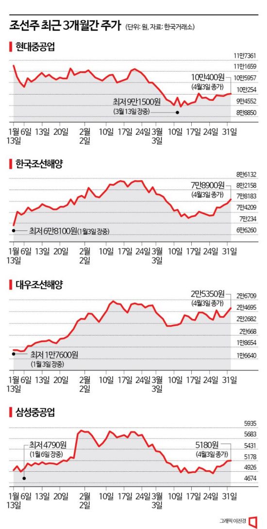 이에 우리 조선사들의 수주목표치도 빠르게 채우면서 실적 턴어라운드 기대감도 커지고 있다. 삼성중공업의 1분기 누계 수주금액은 25억달러로, 연간 수주목표치(95억달러)의 26%를 달성했다. 한국조선해양은 약 42%, 대우조선해양은 11%를 달성한 상태다.
