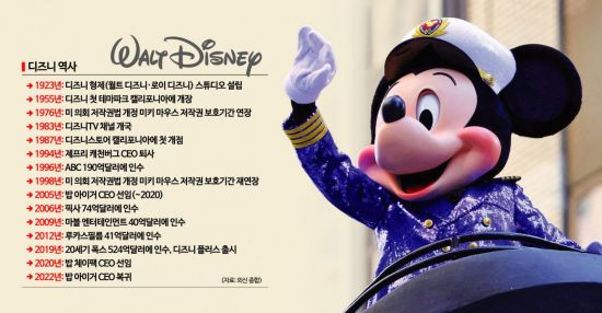 1923년 10월 동심을 자극하는 ‘미키 마우스’ 캐릭터 하나로 시작해 애니메이션·영화·음악·방송·온라인동영상서비스(OTT)를 아우르는 미디어 거물로 성장한 월트 디즈니 컴퍼니가 올해 창립 100주년을 맞는다. 디즈니는 지난 100년 간 유력 경쟁사를 인수합병(M&A)하는 방식으로 몸집을 불리며 시가총액 1830억달러(약 241조원)·글로벌 56위 기업으로 우뚝 섰지만 OTT 등 기술혁명의 벽을 넘지 못하고 적자에 허덕이고 있다. 잇단 악재에 한계를 느낀 디즈니는 최근 경영진을 물갈이하는 등 쇄신에 나서며 다음 100년을 위한 반전을 꿈꾸고 있다.