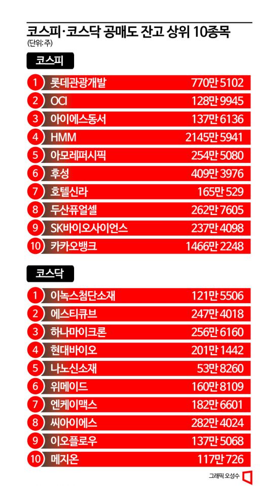 4일 한국거래소에 따르면 공매도 잔고 상위 10개 종목(집계 가능한 가장 최신 날짜인 3월30일 기준)은 롯데관광개발·OCI·아이에스동서·HMM·아모레퍼시픽·후성·호텔신라·두산퓨얼셀·SK바이오사이언스·카카오뱅크 순으로 집계됐다. 여기서 주목할 점은 10개 종목 모두 외국계 투자회사만 공매도 잔고 대량 보유자로 이름을 올렸다는 것이다. 공매도 잔고 대량 보유자는 상장주식수 대비 0.5% 이상을 공매도 한 경우를 말한다. 국내 증권사는 한 곳도 없었다.