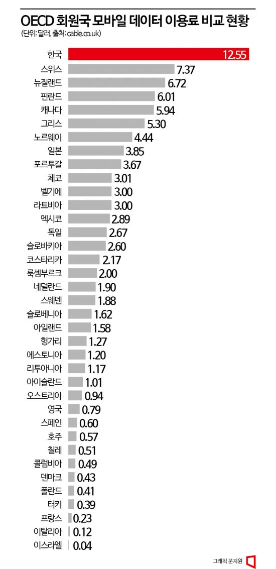 한국의 데이터 사용 비용은 미국(5.62달러), 일본(3.85달러), 독일(2.67달러), 스웨덴(1.88달러), 싱가포르(0.61달러), 호주(0.57달러)보다도 월등히 높다.