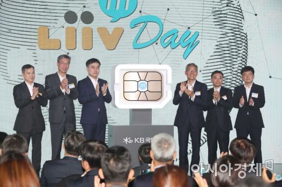 28일 서울 중구 반얀트리 클럽 앤 스파 서울에서 열린 KB국민은행 알뜰폰 브랜드 '리브엠(Liiv M)' 출시 행사에서 참석자들이 출시 세레모니를 하고 있다. 왼쪽부터 하현회 LG유플러스 부회장, 허인 KB국민은행장, 손병두 금융위원회 부위원장, 윤종규 KB금융지주 회장, 이태희 과학기술정보통신부 통신정책국장, 최성호 방송통신위원회 이용자정책국장. /문호남 기자 munonam@