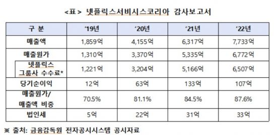 넷플릭스 본사의 매출액 대비 매출원가 비중은 지속 감소하는 추세다. 지난해 기준 60% 수준이다. 국내에서는 매출원가 비중을 2019년 70.5%, 2020년 81.1%, 2021년 84.5%, 2022년 87.6%로 인상했다. 해외 수익 이전과 법인세 회피 문제가 지속해서 지적되고 있음에도 여전히 개선되지 않고 있다. 지난해 넷플릭스가 국내에서 벌어들인 매출액(7733억원) 중 6772억원이 해외 그룹사로 송금됐다고 의원실은 설명했다.