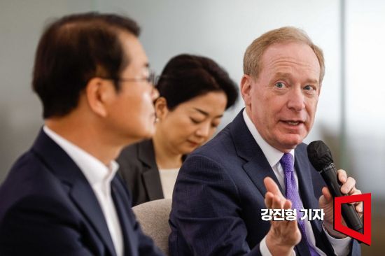 브래드 스미스 마이크로소프트 부회장 겸 총괄 사장이 18일 서울 용산구 숙명여대에서 열린 '고용노동부-마이크로소프트 청년 간담회'에 참석해 인사말 하고 있다.