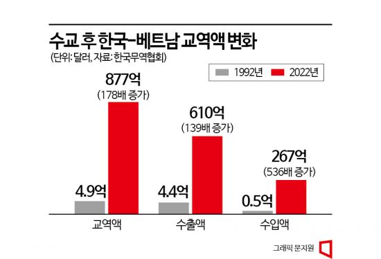 지난해 대(對) 베트남 무역수지 흑자가 342억5000만달러(약 43조원)로 베트남이 한국의 사상 최대 무역수지 흑자국으로 발돋움할 수 있었던 키워드 셋이다. 미·중 패권 경쟁이 치열하게 벌어지면서 대미 수출의 우회기지가 필요해진 기업들이 안정적인 수출시장을 확보하기 위해 베트남에 눈을 적극 돌리고 있다.