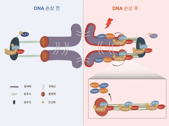 연구팀은 난자가 성숙 과정에서 DNA 손상이 발생하면, 염색체와 방추사가 상호작용하여 DNA 복구에 필요한 인자들을 방추극에서 방추사-동원체로 이어지는 경로를 통해 염색체로 이동시키는 것을 확인했다. 또 DNA 손상복구 인자의 이동이 CIP2A 단백질을 매개로 일어나며, PLK1 인산화 효소를 통해서 제어됨을 규명했다.