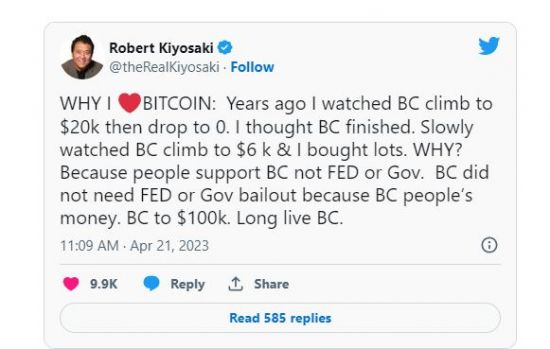 최근 기요사키는 조 바이든 미국 대통령, 미 재무부 등에도 강한 비판을 쏟아내기도 했다. 미 정부가 미국이나 세계 경제 현황에 대해 '거짓말'을 하고 있다는 것이다. 그는 지난 17일 트위터에 "비트코인은 지난 1년간 100% 상승했다. 나는 앞으로도 비트코인 강세에 베팅할 것"이라며 "왜 사람들이 금, 은, 비트코인에 투자하는가. 그건 Fed와 재정부, 바이든 대통령이 거짓말쟁이이기 때문"이라고 했다.