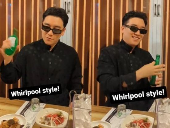 검은색 셔츠를 입고 선글라스를 쓴 승리는 밝은 표정으로 소주병을 흔들면서 "이게 한국의 전통 스타일"이라고 말했다.