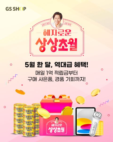 1일 업계에 따르면 GS샵은 5월 한 달간 쇼핑 행사 ‘혜자로운 상상초월’을 진행한다. 적립금·사은품·쿠폰 제공과 카드 할인 등을 모두 합치면 350억원에 달하는 혜택이 고객에게 돌아가는 대규모 행사다. GS샵은 이 기간 적립금 10억원 증정 행사 외 4행시 백일장 등 참여형 이벤트를 통해 다이슨 에어랩, 그랜드 하얏트 호텔 상품권, 아이패드 등 경품을 제공할 방침이다.