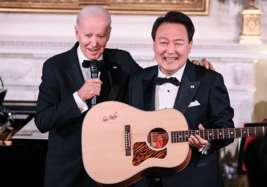 이날 조 바이든 미국 대통령이 주재한 만찬은 음악 공연과 함께 진행됐다. 만찬 도중 윤 대통령은 바이든 대통령과 함께 무대에 올랐다.