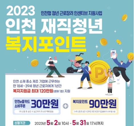 인천시가 중소기업에 근무하는 청년들에게 복지포인트를 지원하기 위해 오는 31일까지 신청자를 선착순 모집한다.