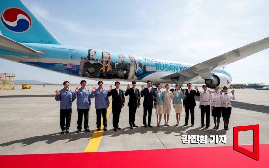 3일 인천 중구 대한항공 정비 격납고에서 대한항공 직원들이 부산세계박람회 유치 기원 래핑 항공기를 공개하고 있다.