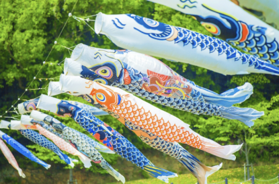 또 이 시즌에는 잉어 모양의 장식을 장대에 걸어 늘어뜨리는 '고이노보리'가 곳곳에 설치됩니다. 펄떡펄떡 뛰는 잉어처럼 생명력 강하게 자라라는 의미에서 나온 풍습인데요. 요새는 남자아이의 날이라기보다는 어린이날이라는 분위기에 맞춰 으레 흩날리는 깃발이 됐습니다.