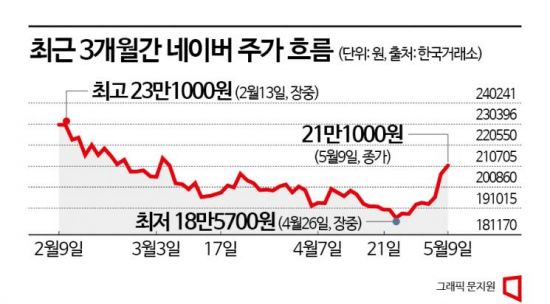 한국거래소에 따르면 9일 네이버 주가는 전거래일 대비 1.93% 상승한 21만1000원에 거래를 마쳤다. 네이버 주가는 지난 26일 이후 8거래일 연속 상승 마감하며 강세를 보였다. 카카오는 이날 전거래일 대비 0.35% 하락한 5만7500원에 장을 마쳤다. 연초 대비(1월2일~5월9일) 해서도 네이버는 18.87% 상승한 반면 카카오는 8.29% 상승하는 데 그쳤다.
