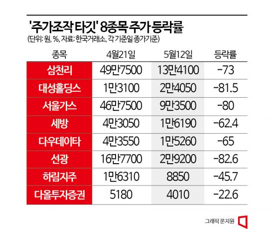 15일 한국거래소 정보데이터시스템에 따르면 이번 사태에 휘말린 서울가스·대성홀딩스·삼천리·하림지주·다우데이타·선광·세방·다올투자증권 총 8개 종목의 시가총액은 사태가 터지기 직전인 지난 4월21일 총 12조1949억원에서 지난 12일 3조7216억원으로 쪼그라들었다. 불과 3주 사이에 8조4732억원이 사라진 것이다.