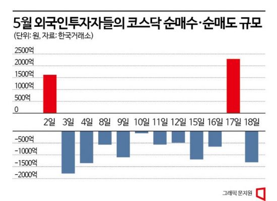 한국거래소에 따르면 외국인들은 이달 들어 첫 거래일인 2일과 17일을 제외하고 11거래일 동안 코스닥에서 순매도 포지션을 취한 것으로 나타났다. 3일부터 16일까지 9거래일 동안은 연속 순매도를 보였다. 2012년 6월27일~7월9일 9거래일 연속 순매도 행렬을 나타낸 이후 약 11년 만의 최장 기록이다. 이달 들어 외국인의 코스닥시장 순매도 규모는 5284억원에 이른다.