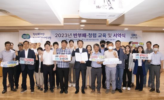 이날 경기연구원 임직원은 청렴캠페인 서약식을 갖고 ▲법과 원칙준수 ▲외부의 부당간섭 배제 ▲금품ㆍ향응 수수 금지 ▲내부 공익신고 장려 ▲이해충돌 방지법령 준수 등을 약속했다. 또 연구윤리 규칙 숙지와 어떠한 연구윤리 위반도 하지 않는다는 서약도 했다.