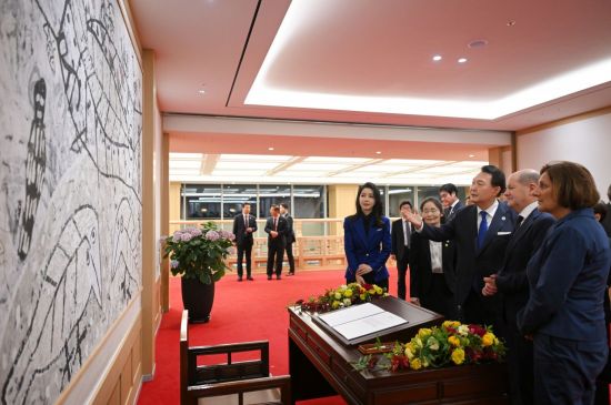 윤석열 대통령이 21일 오후 서울 용산 대통령실 청사에서 열린 한독 정상회담에 앞서 올라프 숄츠 독일 총리에게 파독 간호원 출신 고(故) 노은님 작가의 작품을 소개하고있다. [사진=연합뉴스]
